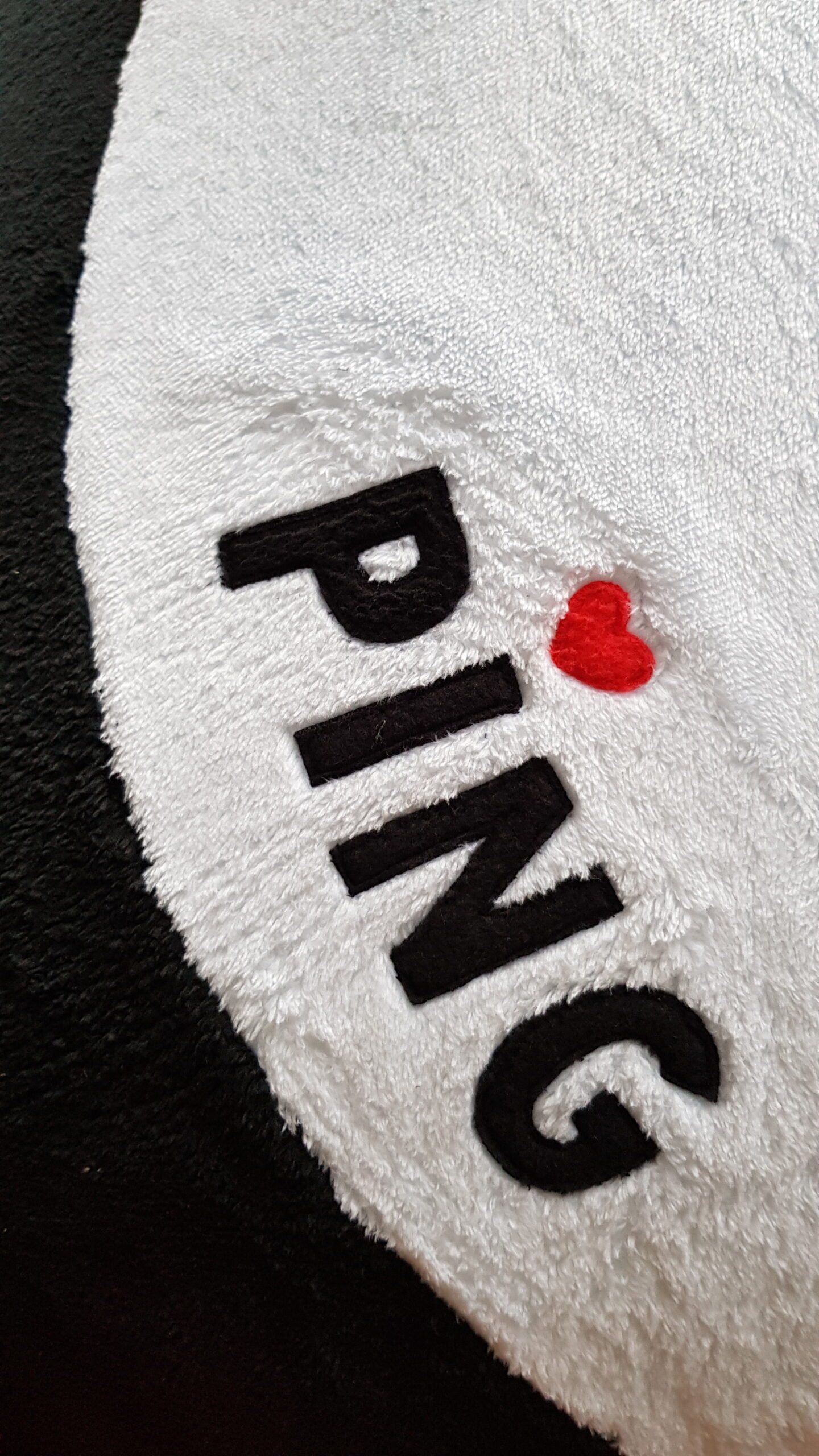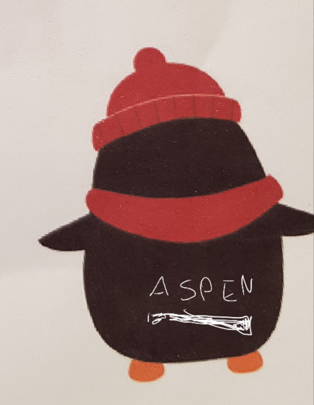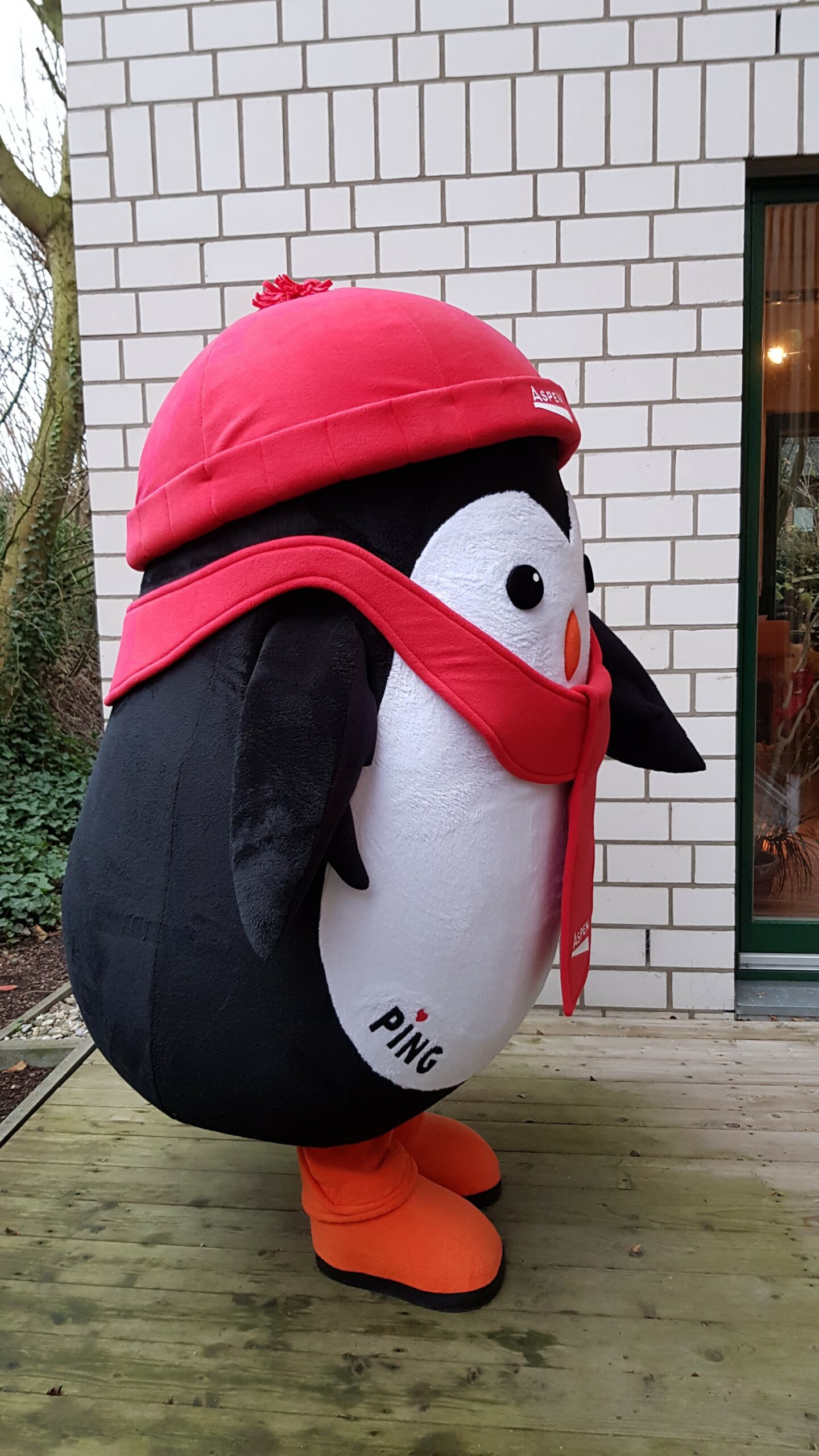 Der überaus liebenswerte „Ping“, ein Pinguin, der sich im Ski fahren übt. Damit er nicht friert, trägt er Mütze und Schal laut Entwurf seines zeichnerischen Schöpfers.