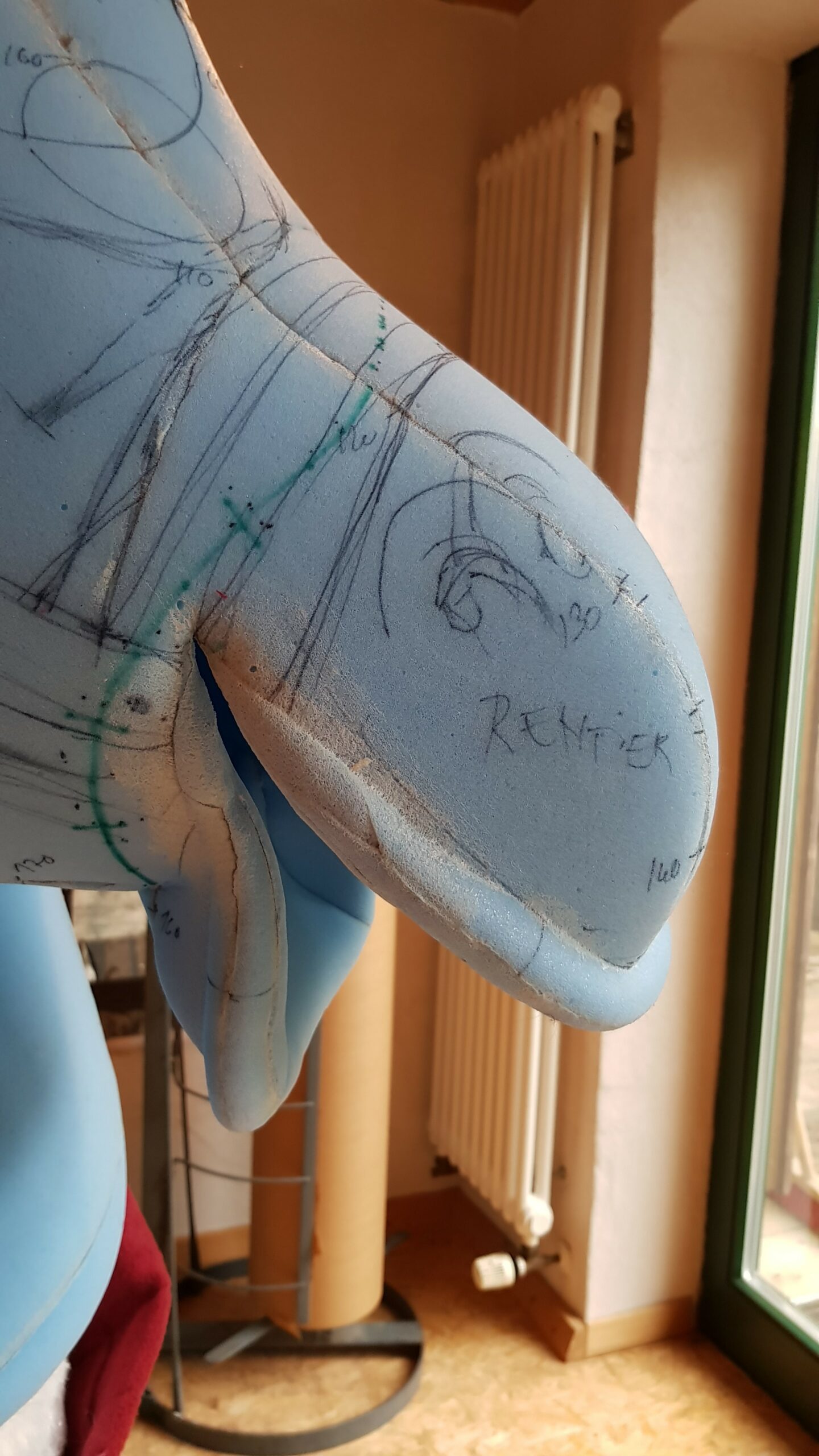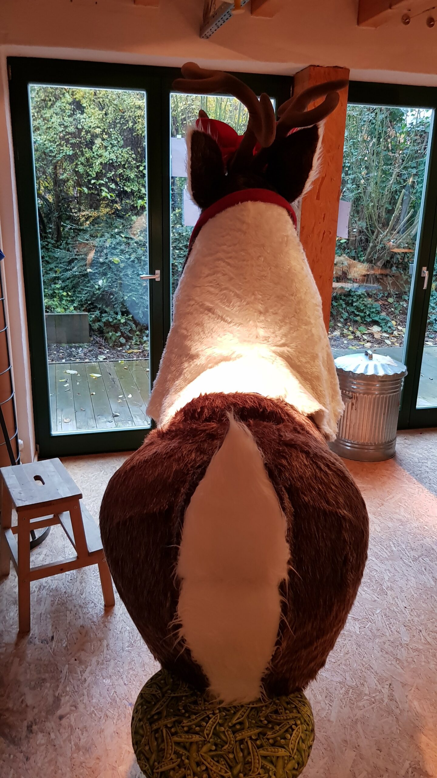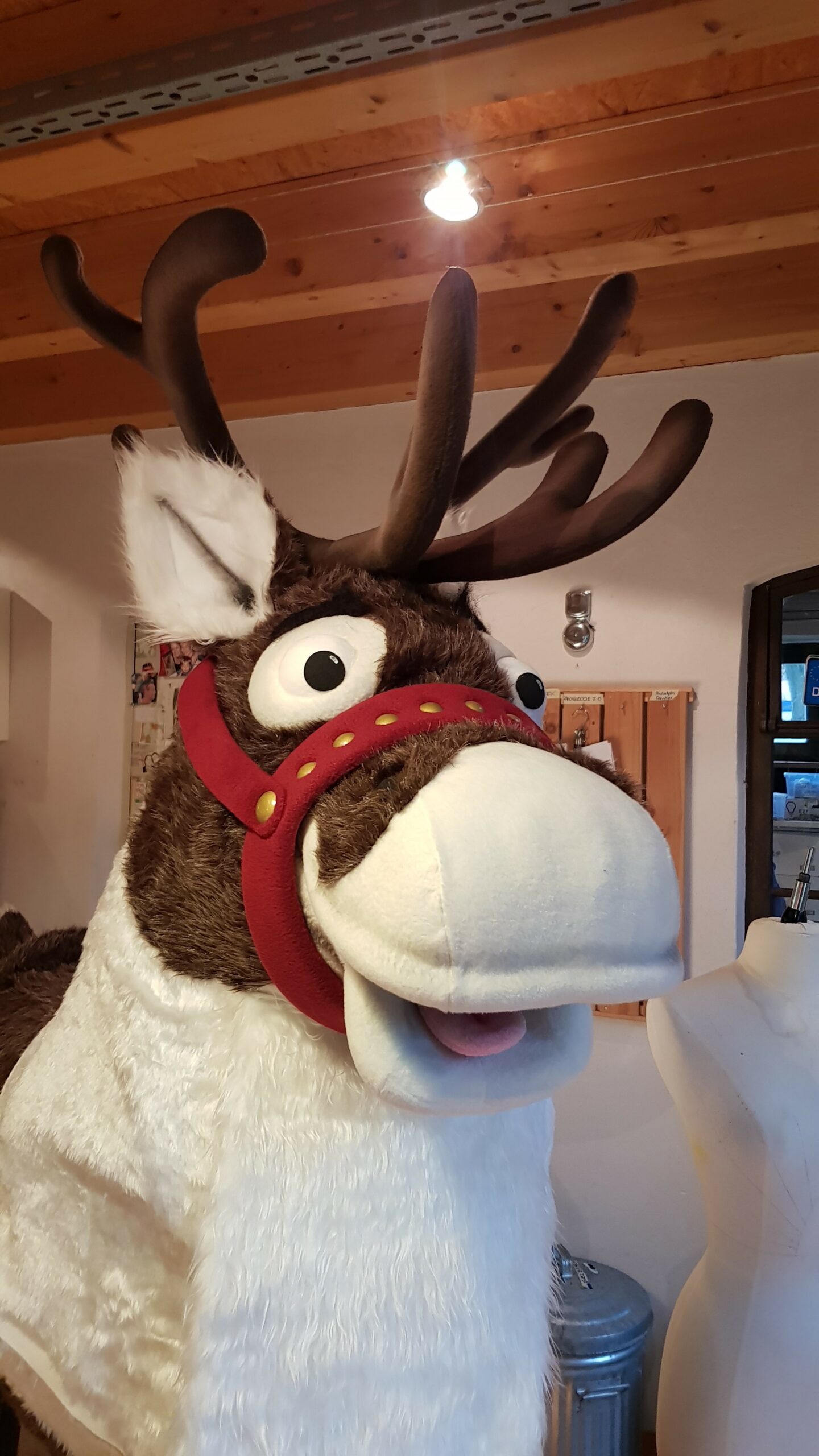 Tatsächlich sind es sogar zwei Rentiere in einem, „Rudolph“ und „Blitzen“. Neben der Herausforderung, diesen aufwändigen Kostümbau auf 4 Beine zu stellen, einen sicheren Reitsitz für ein Kind zu schaffen und beide Charaktere in einem Kopf unterzubringen (umbaubar!) gab es zahlreiche weitere Aufgaben: